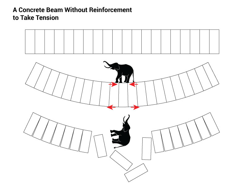 When a beam is loaded with weight, it bends a little bit. The top is pushed together (compression) and the bottom is pulled apart (tension). Without reinforcement, the part of the beam that’s pulled apart (in tension) will crack, crumble, and ultimately collapse.